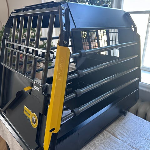 Finns en metalbit som saknas vid ena horn där lastöglar var men vid tog bort dom och monterade under hundburen. Se sista bild.