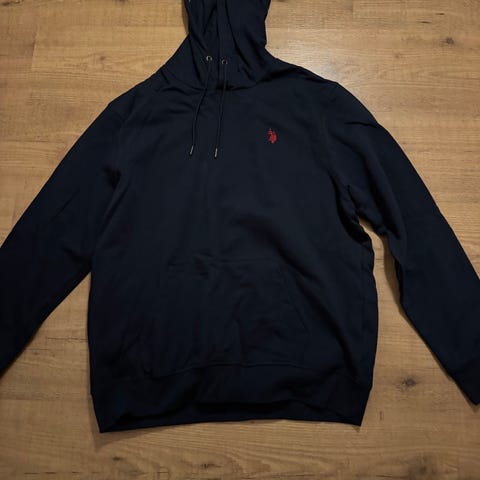 U.S. Polo ASSN mjukisset för herr i storlek L. Setet består av en långärmad tröja och byxa i grå bomull. Tröjan har huva med dragsko och liten logodetalj på bröstet. Byxan har resår i midjan med dragsko, sidfickor och matchande logodetalj. Materialet är bomull, vilket ger en mjuk och bekväm känsla mot huden. Färg: grå. Setet är ganska tunt och perfekt för lite svalare väder👍