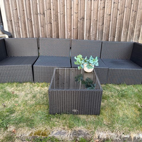 Tillhörande 2 låga bord i samma konstrotting med två glasskivor ovanpå. Passar som utegrupp på altan, balkong eller i trädgård.