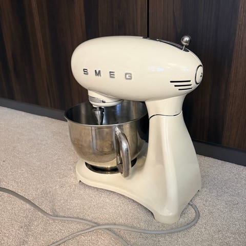 Smeg köksmaskin i svart utförande med rostfri bunke som rymmer 4,8L. Maskinen levereras med flera tillbehör, bland annat ballongvisp, degkrok och blandare, vilket gör den lämplig för vispning, knådning och blandning av olika ingredienser vid bakning och matlagning.