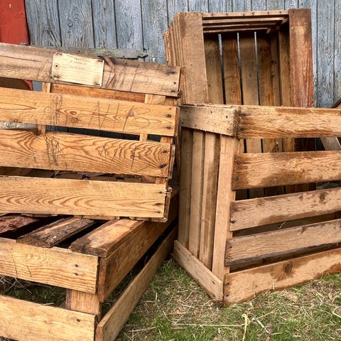 Trälådor för förvaring i brunlaserat trä. Lådorna har öppna sidor med ribbor och kan staplas eller placeras på högkant för olika typer av förvaring eller som enkel hyllförvaring. Passar exempelvis till förvaring av böcker, dekoration, leksaker eller andra föremål i hem, förråd eller garage.