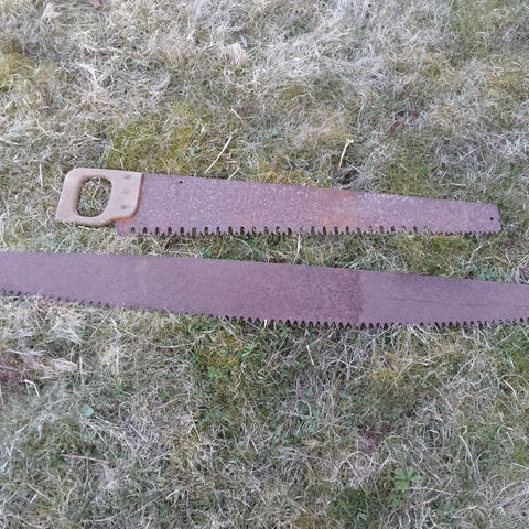 Timmertång i metall för hantering och lyft av stockar eller timmer. Verktyget har två böjda griparmar som möts i ett korsat gångjärn och ett handtag upptill. Passar för arbete i skog eller vid vedhantering.