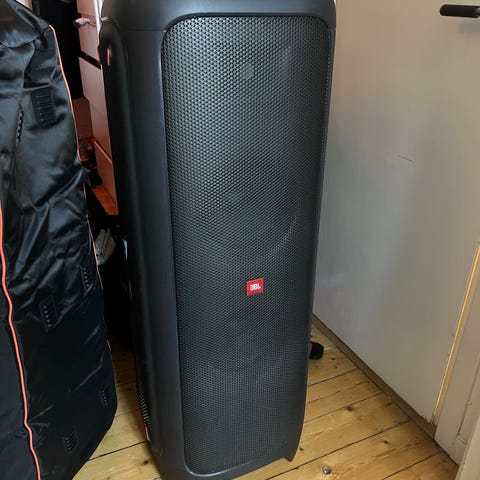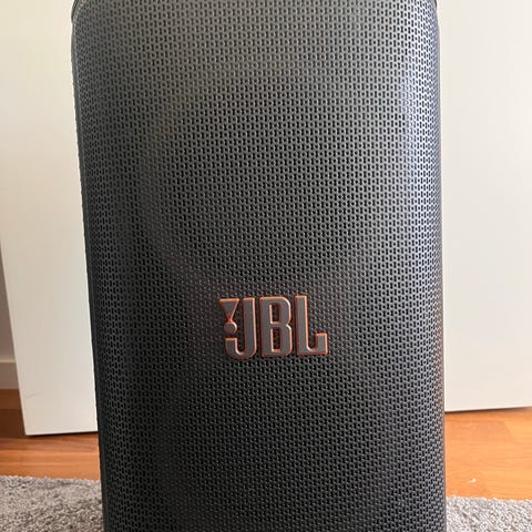 JBL PartyBox 310 högtalare i svart utförande. Portabel festhögtalare med inbyggda reglage på ovansidan för volym, ljuseffekter, Bluetooth-parning, uppspelning och ljudinställningar. Baksidan har anslutningar för strömkabel och extra ljudingångar samt bärhandtag för enklare transport. Lämplig för musikuppspelning inomhus och utomhus där kraftigare ljud önskas.