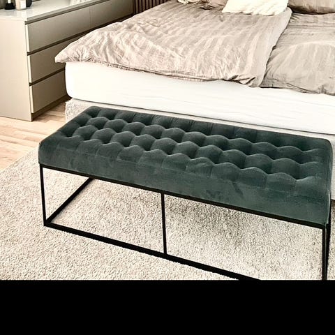 Sittbänk ”Lizette” från Mio med sits i grå sammet och underrede i metall. Sitsen är vadderad och pikerad både för komfort och för ett snyggt uttryck.