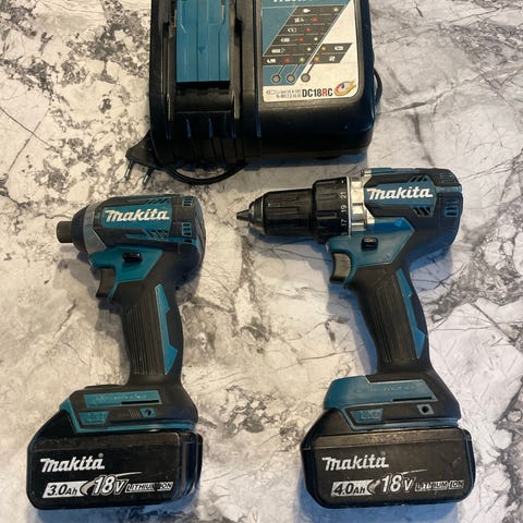 Makita borrskruvdragare 18V med två batterier och laddare. Ingår även flera borr och bits i olika storlekar samt hållare för bits. Passar för borrning och skruvdragning i hemmet, verkstaden eller vid renoveringsarbeten där en sladdlös maskin underlättar arbetet.