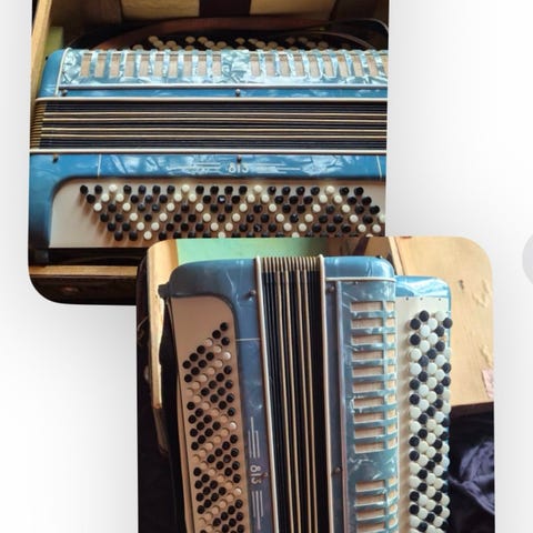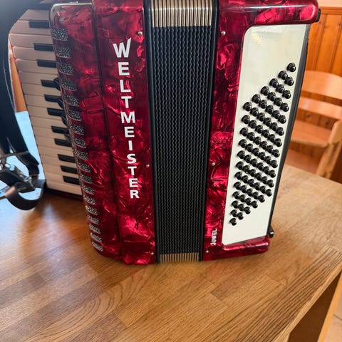Aidi dragspel i röd pärlemorfärgad finish. Instrumentet har knappar på diskant- och bassida samt bälg med remmar för axel och hand. Dragspel av denna typ används för spel i till exempel folk- och dansmusik. Medföljer hårt fodral/väska med handtag för förvaring och transport.för barn