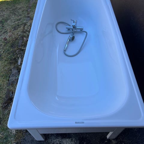 Badkaret är rektangulärt med väggmonterad blandare och duschset.