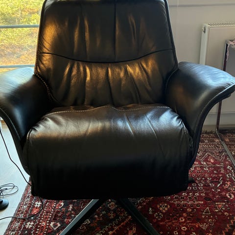 Klassisk fåtölj i mörkbrunt läder med tillhörande fotpall. Utrustad med handtag för att justera ryggstödet och luta stolen efter behov.