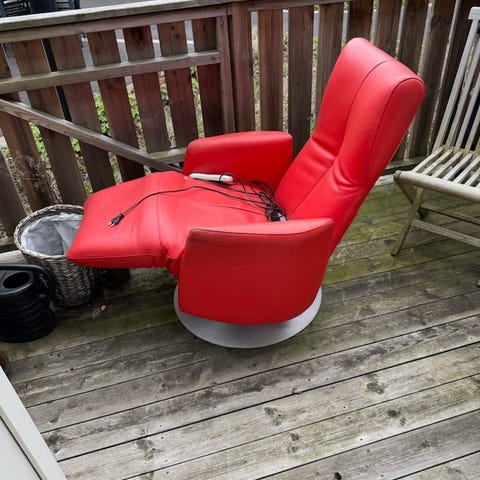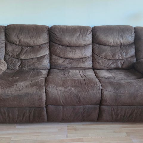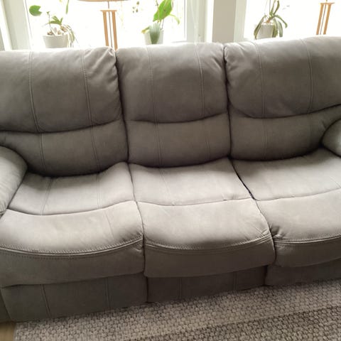 Reclinersoffa och reclinerfåtölj skänkes i grått tyg.