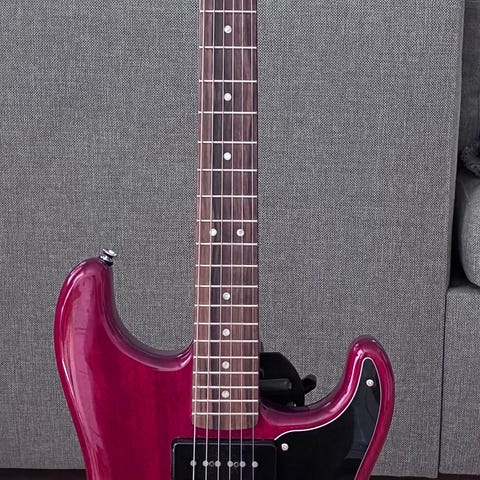 Fin gitarr i glittrigt rosa 😃 funkar för en bred musiksmak i och med Humbuckers och splitcoil.