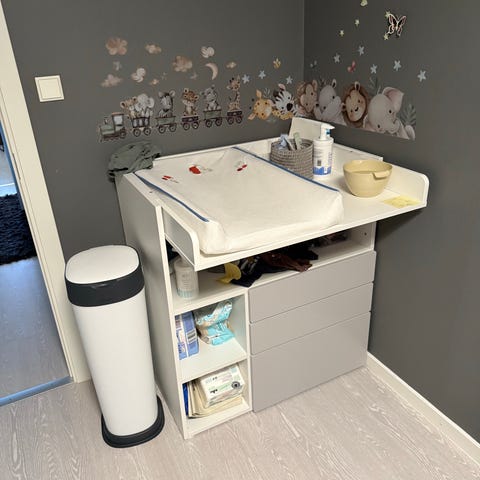 Väggmonterat skötbord i trä och vitt. Skötbordet fälls ner från väggen och ger en skötplats med omgivande kanter. Över skötbädden finns en hylla för förvaring av tillbehör. När skötbordet är uppfällt tar det liten plats och fungerar som en slät front mot väggen. Passar för montering i barnrum, badrum eller hall där man vill spara golvyta.