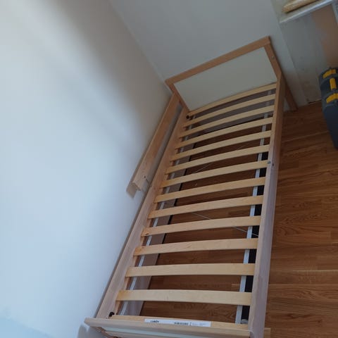 Säng 1 med ribbotten, madrass, madrasskydd, två sänglådor, rosa sängtält och extra stödbräda.