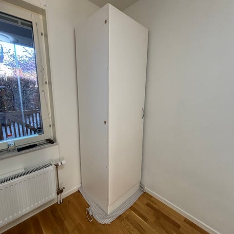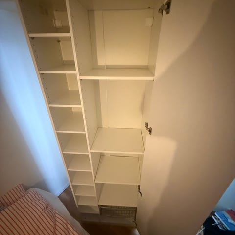 Vit garderob med smal spegel. Hyllor till vänster och hängare till höger.