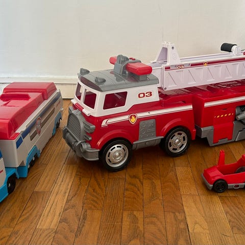 Paw Patrol leksaksfordon set i plast. Setet består av flera större fordon i röd, blå och vit färg, bland annat lastbilsliknande fordon, brandbilsinspirerat fordon och ett flygplansliknande fordon. Lämpligt som leksak för barn som gillar fordon och Paw Patrol-tema. Alla delar är gjorda i hård plast med rullande hjul på markfordonen.