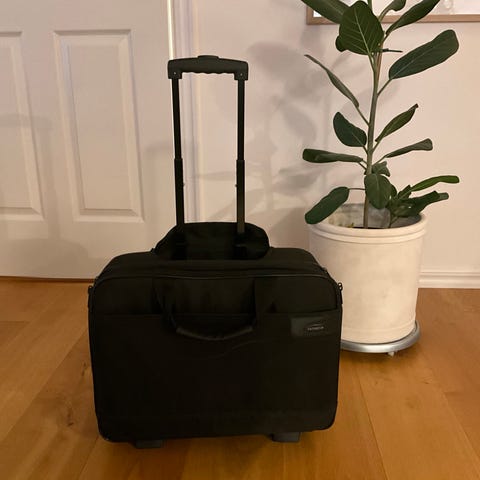 En pilotdrag väska med kodlås, kompakt väska med hjul och teleskophandtag, designad för piloter och besättningsmedlemmar eller för andra som enkelt vill kunna transportera arbetsmaterial, headset, dokument, dator och personliga tillhörigheter. I läder och fuskläder. Mått 58x48x25 cm