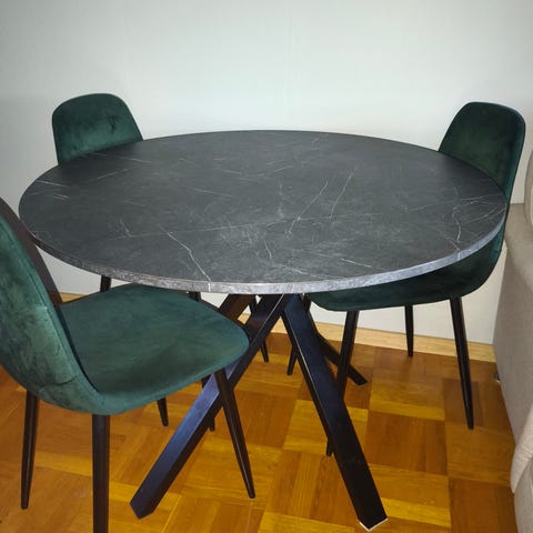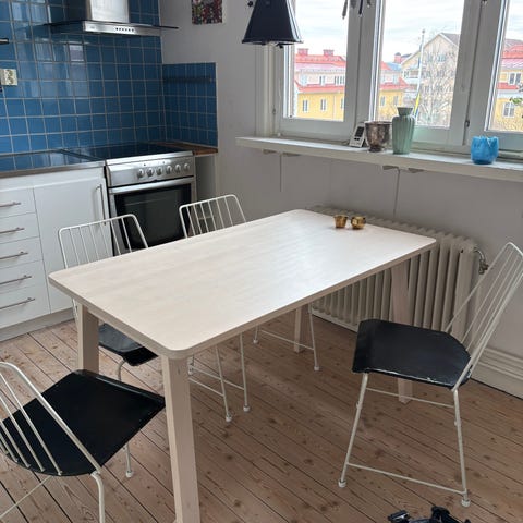 Jag säljer ett matbord och 2 stolar pga flytt. Ett praktiskt matbord som inte tar för stor yta. Stolarna är lite missfärgade men jag har inte heller försökt att tvätta de så det ska nog inte va ett problem. Matbordet är 75cm i bredd och 73 i höljd
