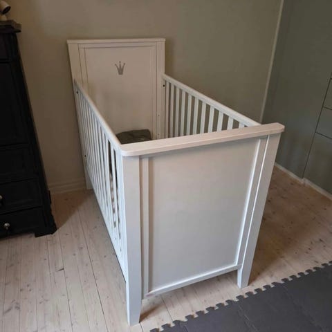 Fin spjälsäng, madrass ingår, ena sidan bara låga skyddet. Hiss finns, kan hjälpa bära till bil. Står nu monterad men kan plocka isär om ni vill.