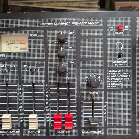 Stereoanläggning med inbyggd skivspelare och kassettspelare. Övre delen består av en skivspelare för vinylskivor, medan den nedre delen har kassettspelare och reglage för ljudinställningar. På den andra bilden syns en fristående skivspelare med tallrik i metall. Utrustningen är avsedd för uppspelning av musik från vinylskivor och kassettband i hemmamiljö. Båda är ur funktion.