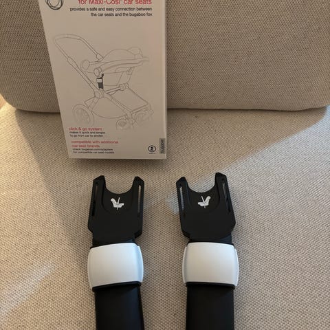 Adapter till barnvagn. Adapterparet används för att fästa kompatibla babyskydd eller sittdelar på en Bugaboo-barnvagn. Tillverkad i hårdplast med detaljer i ljusare plast.