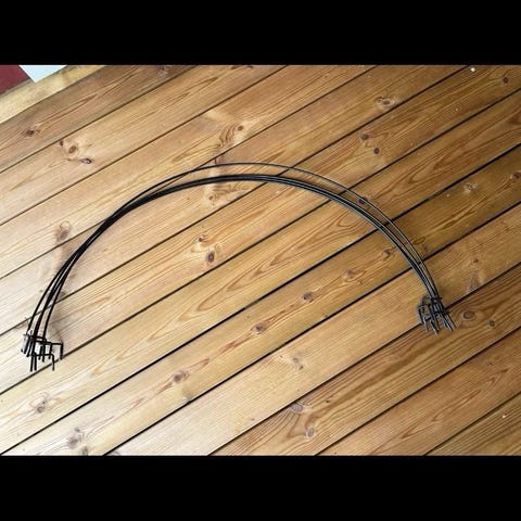 Bågen är i polerad metall / rostfritt utförande och har nummerskylthållare monterad. På bilderna syns normalt bruksslitage med repor, märken, ytrost vid fästpunkter samt en buckla / intryckning på ett av rören.
