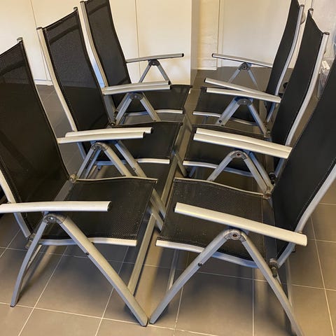 Utemöbel set bestående av ett rektangulärt bord, två positionsstolar och en matchande utomhusmatta. Bordet har ljus bordsskiva och metallben. Positionsstolarna är hopfällbara med justerbar rygg och armstöd, klädda i tyg med gråblått mönster. Utomhusmattan har liknande grått och blått randigt mönster och är anpassad för utebruk, exempelvis på altan eller uteplats.