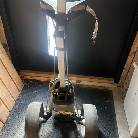 Golfvagn med två hjul i svart utförande. Vagnen är hopfällbar för enklare förvaring och transport.