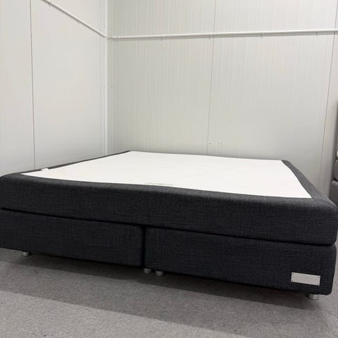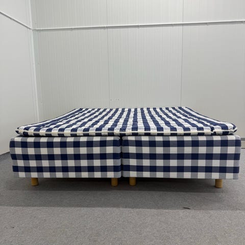 Hästens BJ säng med bäddmadrass i klassiskt blåvitt rutigt tyg. Sängen består av två underdelar som tillsammans bildar en dubbelsäng, med träben i naturträ. Bäddmadrassen är märkt Hästens BJ och har samma blåvita rutmönster som sängbottnarna. Passar som stadig och bekväm sovplats i sovrum eller gästrum.