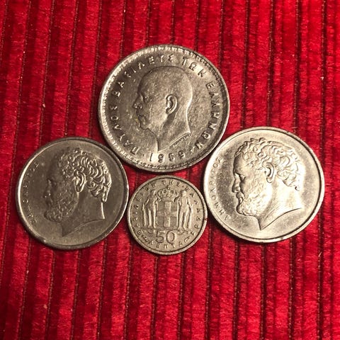 Italien mynt, totalt 3 stycken silverfärgade mynt. Två av mynten är 100 lire med motiv av kvinnoprofil på ena sidan och stående figur med träd och valören 100 på andra sidan. Det tredje myntet är mindre med stående figur på ena sidan och porträtt på andra sidan. Passar för samlare av utländska mynt eller som referensmaterial vid studier av italiensk myntutgivning.