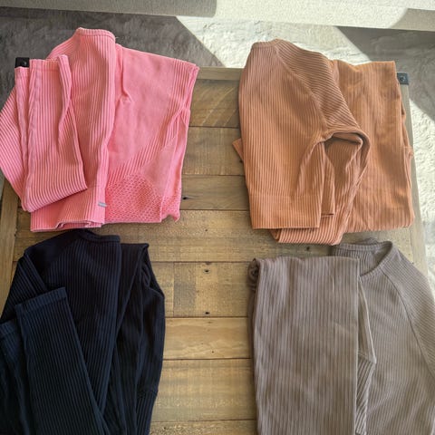 Träningslinnen för dam i storlek 38. Två linnen i funktionellt material anpassade för träning. Ett linne är rosa med gröna detaljer och brottarrygg, det andra har svartvit mönstrad design med brottarrygg.