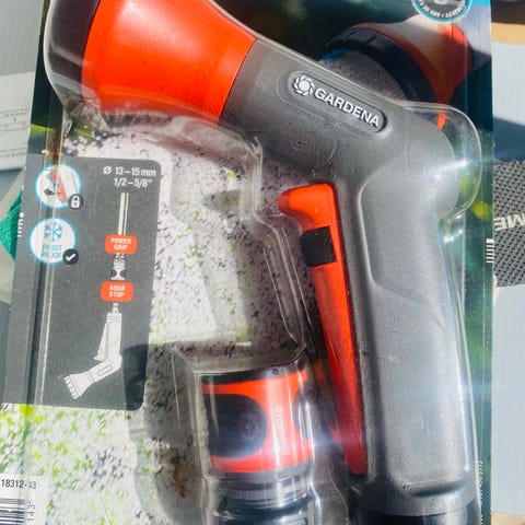 En populär vattenpistol för trädgårdsbevattning och rengöring, med tre olika inställningar och låsbar avtryckare.