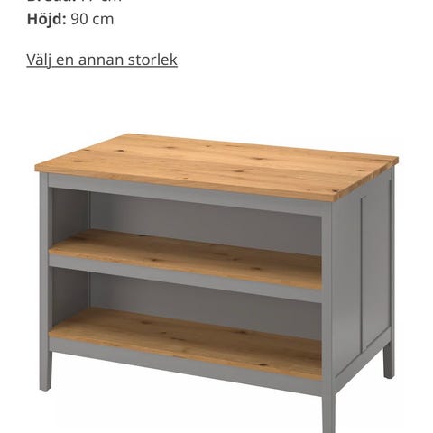 Ikea Vadholma köksö i svart med bänkskiva i ek. Mått cirka 126x79x90 cm. Köksön har rejäl träskiva ovanpå och underdel i svartlackerad stomme. Underdelen har öppna hyllplan med ribbor för förvaring av köksredskap, kastruller eller andra köksartiklar. Passar som extra arbetsyta och förvaring i kök eller matplats.