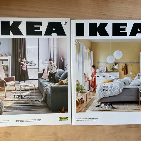 2 st Ikea kataloger 2020 med fokus på inredning och hemtextil. Flera olika omslag med bland annat sovrum, badrum och vardagsrum visas. Katalogerna innehåller bilder och information om möbler, textilier och inredningsdetaljer för hemmets olika rum. Passar för den som vill ha tryckta Ikea-kataloger för inspiration eller som samlarobjekt