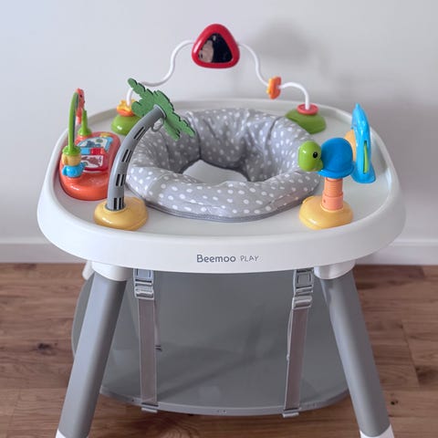 Skip Hop aktivitetscenter för baby i silver plast med grått/vitt sittsäte. Rund modell med roterande tygsäte där barnet sitter med benen igenom. Utrustad med flera fasta leksaker runt kanten, bland annat spegel, pianotangenter, träd- och blomleksaker samt båge med hängande leksaker. Aktivitetscentret står på fyra ben och har en hylla undertill. Passar för små barn som kan hålla upp huvudet själva, som stöd vid lek och träning av motorik.