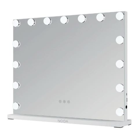 Tjusig spegel med LED-belysning i ljus rosa / kräm färg in real . Spegeln har tredelad design med två vikbara sidopaneler och en större mittspegel. Inbyggda LED-lampor runt mittspegeln ger jämn belysning. Spegeln är monterad på fot och kan vinklas för att justera betraktningsvinkeln. Passar för sminkning och detaljarbete vid daglig skönhetsrutin.