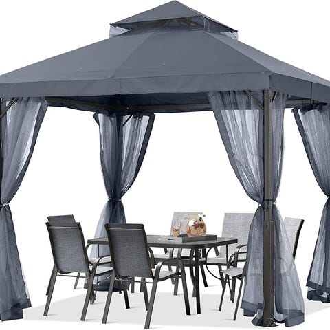 Paviljongen är väl omhändertagen och i gott skick. Tyget kan enkelt tas av och maskintvättas om man vill fräscha upp det inför säsongen.