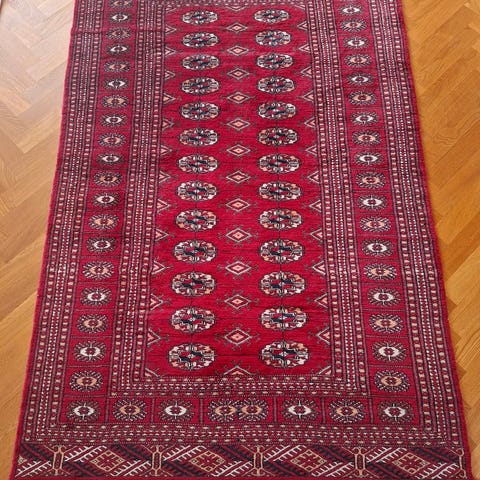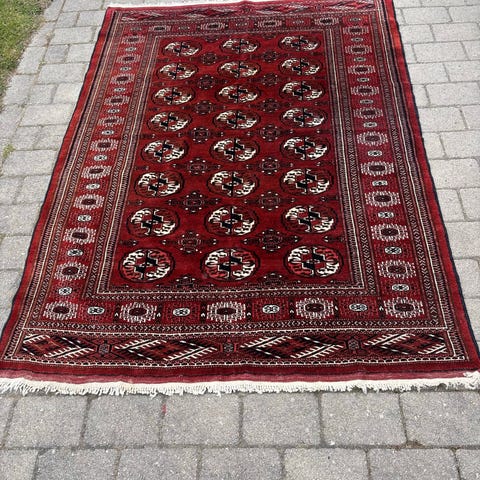 Äldre matta i röd ull med orientaliskt mönster och fransar i kortsidorna. Slitna fransar och i behov av en snötvätt, men fint helhetsintryck och klar i färgerna. Okänt ursprung. 125x180 cm.