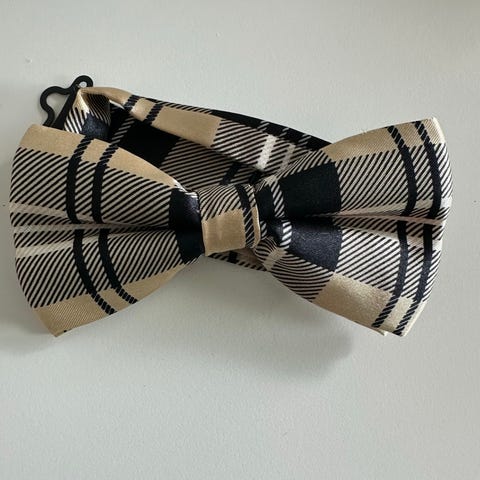 Stilig fluga med justerbart band i rutigt mönster i blått, beige och rosa. Flugan har ett förknutet utförande och stängs med hake, för bästa passform. Passar som accessoar till skjorta och kostym eller andra mer uppklädda tillfällen. Materialet är slätt, vävt satin med lätt glansig yta. Oanvänd, ny i förpackning.