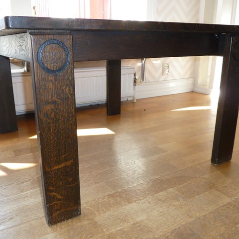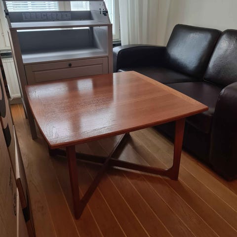 Retro bord gjort i teak tror jag. Väldigt stabilt och det väger en hel del. Benen går att skruva loss. Finns några repor och mindre märken. Bordet är från 50-60 talet
