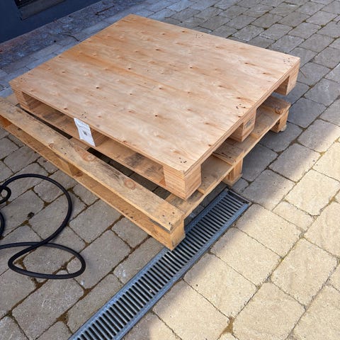 Träpall lastpallar av trä. Tre pallar i standardstorlek som kan användas för förvaring, transport eller olika bygg- och gör-det-själv-projekt. Pallar är använda och har spår av slitage samt viss missfärgning.