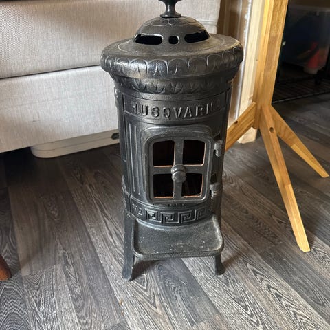 Vedkamin i gjutjärn i svart färg. Modellen har klotformad eldstad med galler framtill och tre ben som ger stabilitet. Övre anslutning för rökkanal. Passar för uppvärmning av mindre utrymmen eller som kompletterande värmekälla där installation av kamin är möjlig och tillåten.