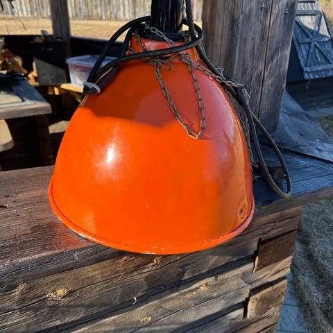 Alfa Laval Baby Warm värmelampa i blå färg. Modellen är märkt med beteckningen 971005-85. Lampan är utformad som en kupad hängande värmelampa, lämplig för uppvärmning i exempelvis lantbruks- eller stallmiljöer där riktad värme behövs. Utförd i robust material med kedja för upphängning enligt bilderna. Tekniska data och säkerhetsanvisningar finns på etiketten på lampskärmen.