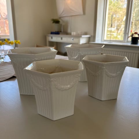 &Tradition Empire kruka i vit keramik. Sexkantig form med reliefdekor längs sidorna. Passar som ytterkruka eller dekorativ behållare inomhus. Märkt Empire Gustavsberg Sweden i botten. 3stora som e 17 cm höga o 2 mindre som e 15 cm höga