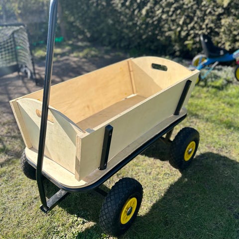 Timmervagn med okänt märke, fyrhjulad konstruktion med stora terrängdäck.