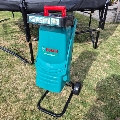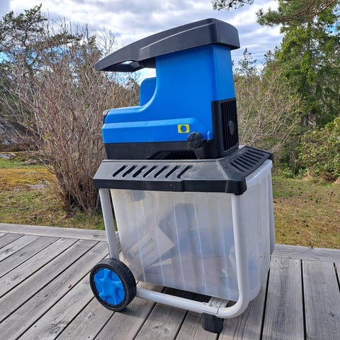 Black & Decker kompostkvarn . Trädgårdsmaskin för flisning och sönderdelning av grenar och trädgårdsavfall. Utrustad med trattformad inmatning upptill och stativ med hjul för enklare förflyttning. Passar för användning i trädgård och vid kompostering av växtmaterial.