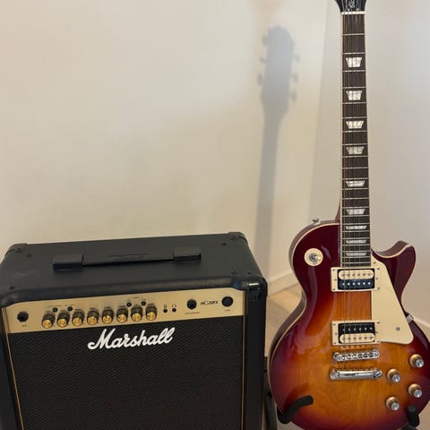 Säljer en Epiphone Les Paul Standard PlusTop Pro från 2014 tillsammans med en Vox VT40X förstärkare.