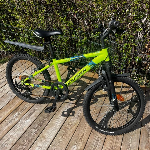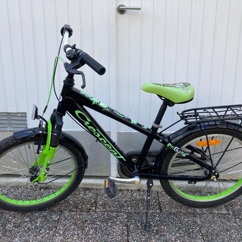 Crescent barncykel med 20" hjul i grön färg. Cykeln har fotbroms bak och handbroms fram, stänkskärmar, kedjeskydd, stöd, reflexer och ringklocka.