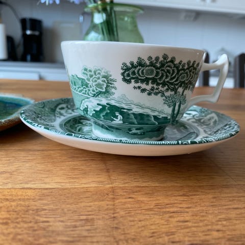 Tekanna och tekopp med fat i porslin. Servisen är vit med lila blommönster.