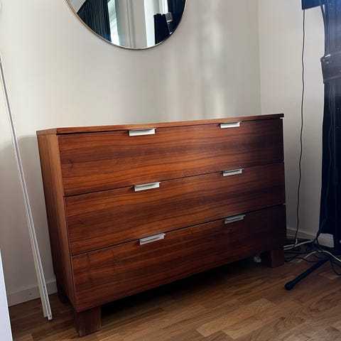 Klädbyrå Bo Concept, körsbärsträ, varsamt använd, i bra skick, 1,76 m lång, 42 cm djup, 90 cm hög. 8 lådor.