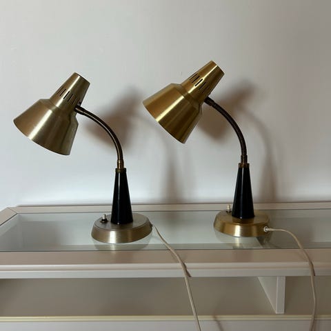 Bordslampor i glas och metall. Från mitten på 60-talet. Patinerad metall. Skärmarna är original. Höjd 57 cm med skärm. Lampfotens höjd 35 cm. Skada i en lampsockel, se sista bild.