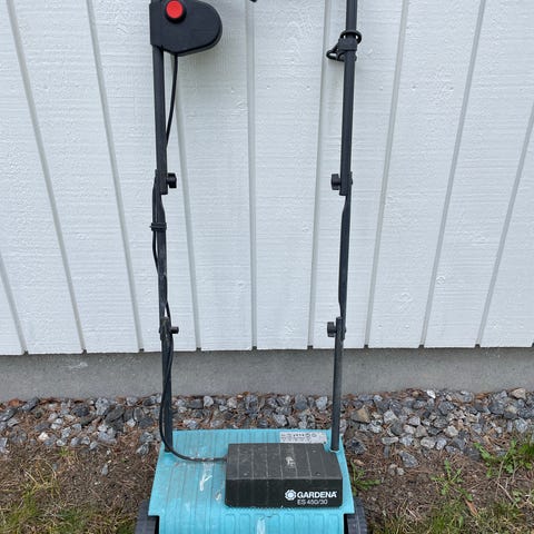 Eldriven mossrivate för bättre gräsmatta. Utrustad med handtag och hjul för att underlätta förflyttning. Säljes pga flytt.
